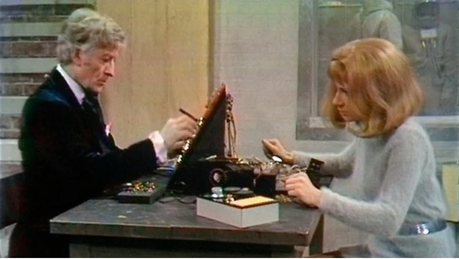 Le Docteur et Liz travaillent sur un appareil de communication (DW: The Ambassadors of Death)